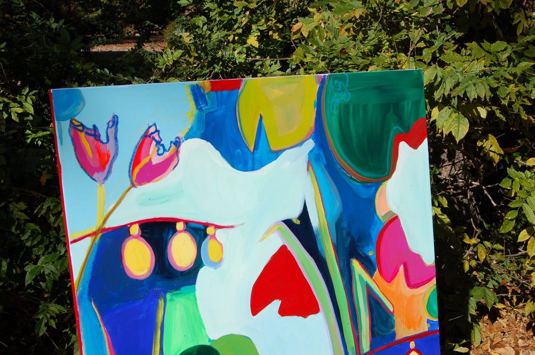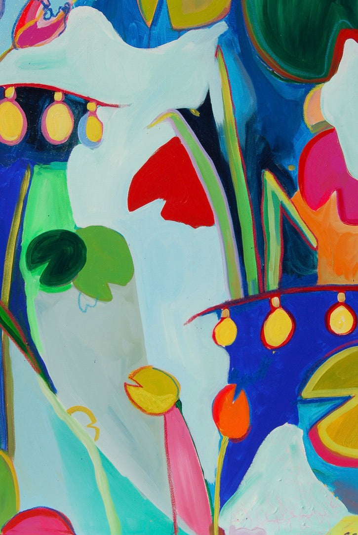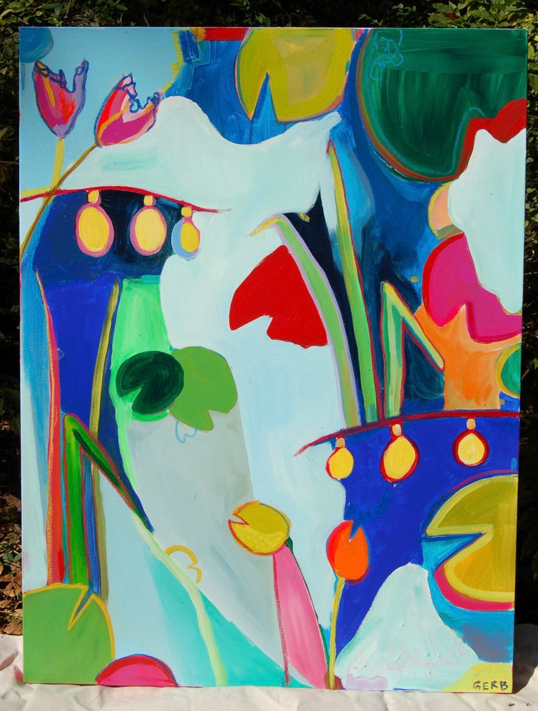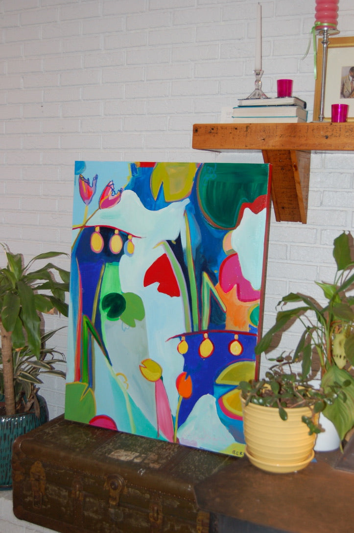 This painting comes from my swamp–lilypad–abstraction chapter back in March of 2024. She is just as bright as she looks in this picture. Leftover Bath Water is a playful dance of color, shape, and texture.