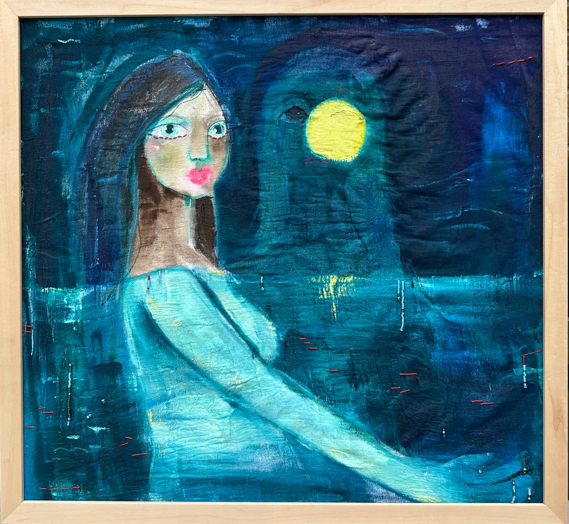 Acrylic, bead, & thread on cloth; framed in natural wood frame
